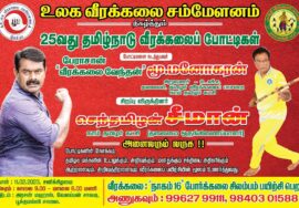 Contact Us To Add Your Business அறிவிப்பு: 11-02-2023 சனிக்கிழமையன்று, சென்னை, பூந்தமல்லி நெடுஞ்சாலை, வேலப்பன் சாவடி, அரசன் மகாலில் நடைபெறவிருக்கும் உலக வீரக்கலை சம்மேளனம் நிகழ்த்தும் 25ஆவது தமிழ்நாடு